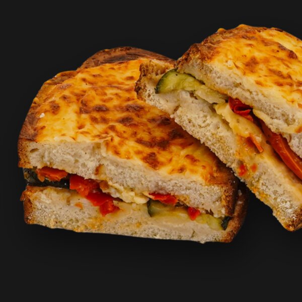 A country bread, a creamy béchamel sauce, and garnished with delicious marinated and grilled vegetables